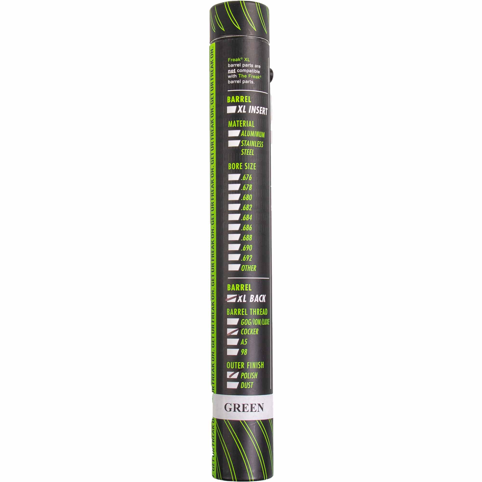There is a large selection for each of the three components of the FREAK® barrel system, from different threads for most markers on the market, to the classic barrel front, All American barrel front or All Condition Performance barrel front, to 9 different inner diameters for the sleeves.