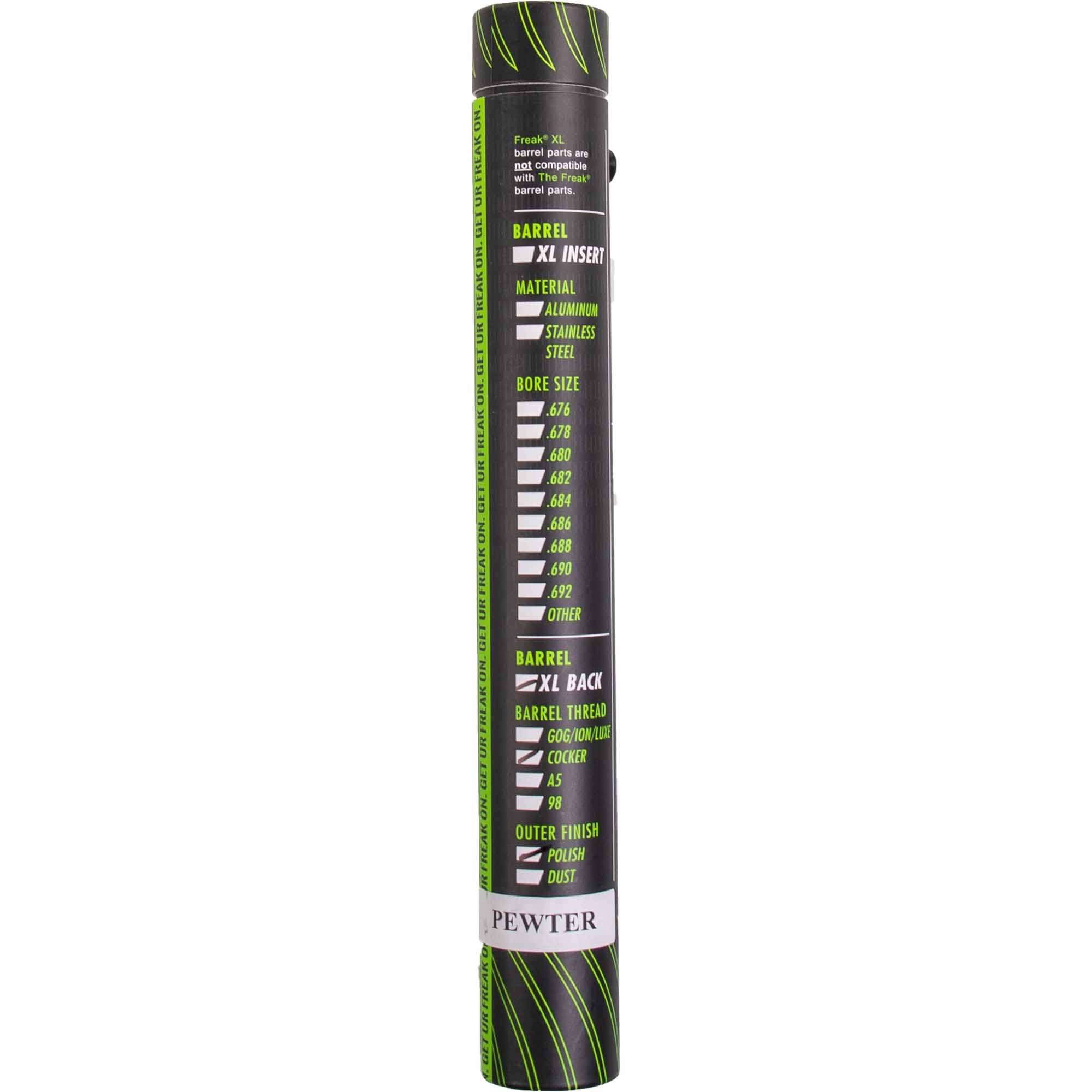 There is a large selection for each of the three components of the FREAK® barrel system, from different threads for most markers on the market, to the classic barrel front, All American barrel front or All Condition Performance barrel front, to 9 different inner diameters for the sleeves.