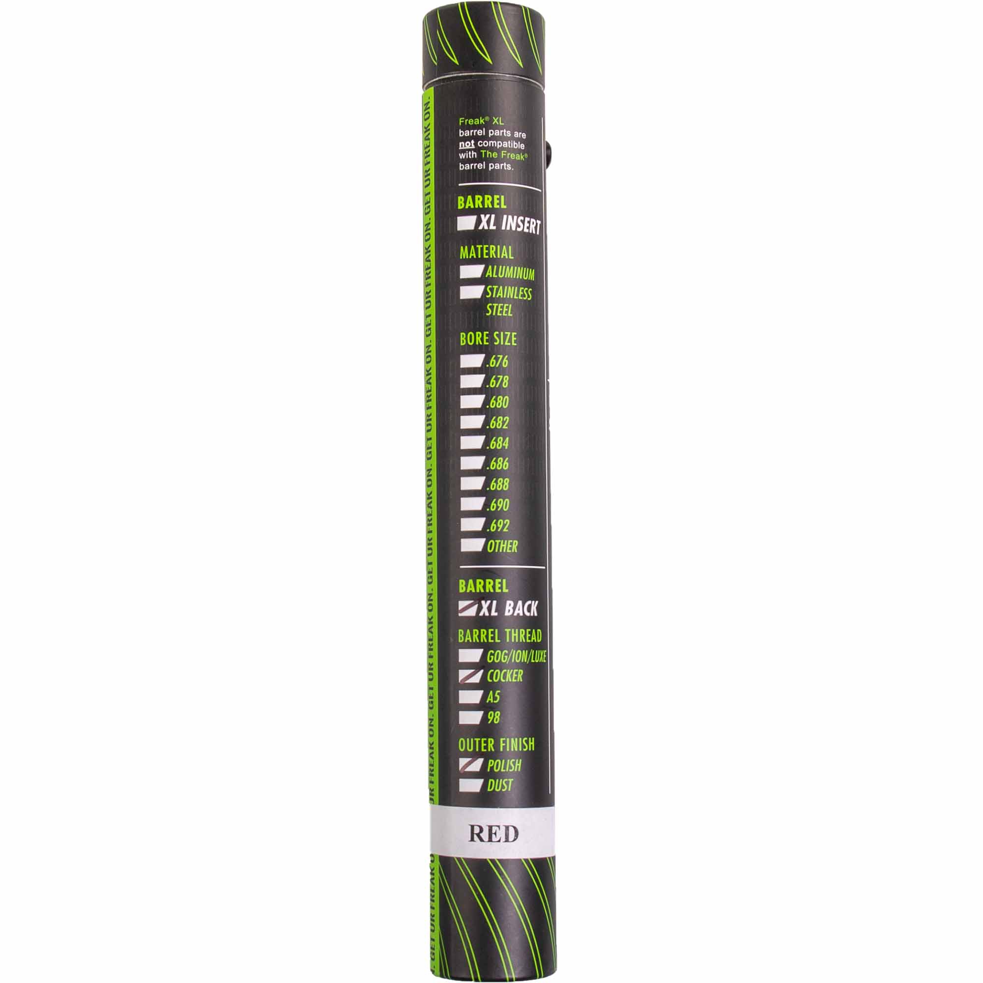 There is a large selection for each of the three components of the FREAK® barrel system, from different threads for most markers on the market, to the classic barrel front, All American barrel front or All Condition Performance barrel front, to 9 different inner diameters for the sleeves.